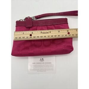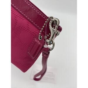 This Coach wristlet in fuchsia pink is perfect for any fashion-forward woman. The rectangular shape and zip closure make it easy to access your belongings, while the patent leather wrist strap adds a touch of elegance. The exterior is made of a durable canvas and leather combination, with a subtle logo pattern for a stylish finish.