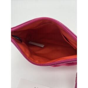 Inside, the wristlet features inner pockets to keep your essentials organized, and the bright orange lining adds a pop of color. The silver hardware complements the pink exterior, making this wristlet a statement accessory. Add this to your collection today!