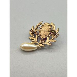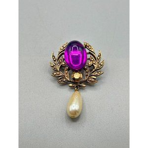Tags: Fuschia brooch, Purple Pin, Fashion Brooch, Pearl Drop, Gold Tone, 80s 90s, Costume Jewelry, Acrylic Cabochon, pearl dangle, dainty elegant, antique style, Wedding Bridal, art nouveau