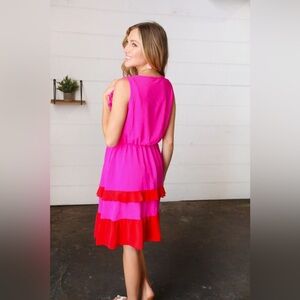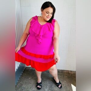 You will love this fuchsia crepe flutter v neck elastic waist midi featuring a contrasting red ruffle hem and side pockets. Stylish and versatile, look elegant in this unique maxi.