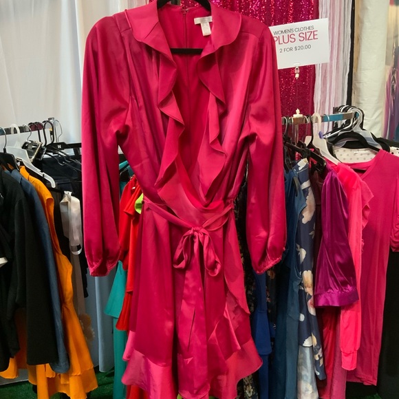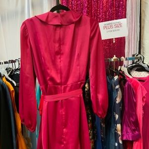 Vibrant fuchsia wrap dress with cascading ruffles. Long sleeves and a self-tie waist. Satin-like sheen. Bold, feminine color.