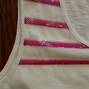 Cream colored 100% cotton body tank with a mesh fuchsia sequence front. No tags but never worn.