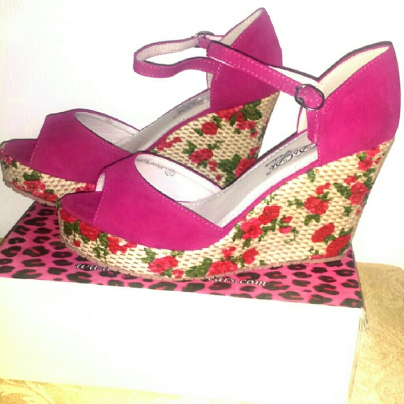 Fuchsia pink wedges with beautiful rose print on heel. Never been worn.