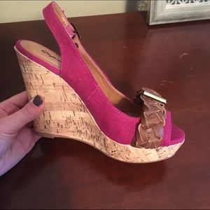 NWOT fuchsia spring wedges. Size 5.5. Cute buckle detail and cork wedge. Also have a tan pair for sale. Bought from local boutique.
