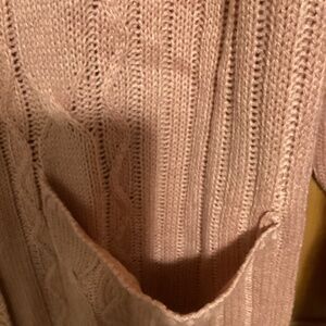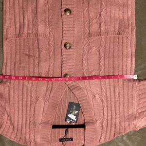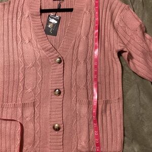 NWT Fuinloth button up cardigan, size medium, pink. Cable knit, with pockets on the front, wood look buttons.
