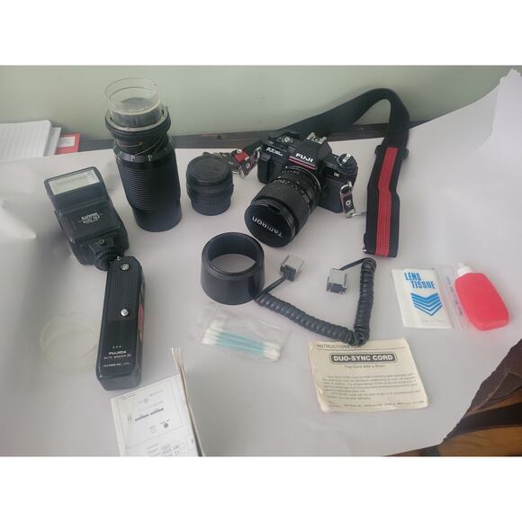 Fuji AX Multi Program Camera, Tamron lenses, smart cord, rewinder, flash.