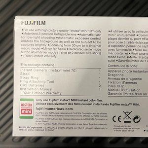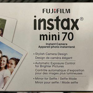 Fujifilm's newest addition to the popular line of Instax cameras - Instax Mini 70. Mini 70 is the Step-Up model to the Mini 8 and offers a more advanced feature set, including, an updated camera design, improved picture quality, especially in dark scenes, new selfie mode with selfie mirror and a tripod socket. Designed to use Instax Mini style film.