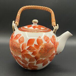 Fujita Kutani Japan Vintage Teapot Wicker Handle Orange Gold