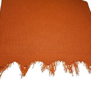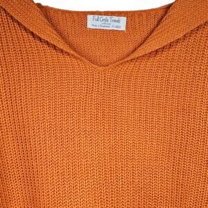 This is a BRAND NEW, soft, acrylic knit sweater in pumpkin orange from Full Circle Trends. It has a relaxed fit and is a size XL. The sweater features a hood, V-neck, and "scarecrow-like" fringing around the green and the ends of the sleeves. This sweater is PERFECT for Fall!