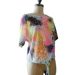 This trendy Full Circle Trends crop top in size S showcases a unique artsy graffiti design. Semi-sheer for a bold look, Scoop neckline, cap sleeves, artsy graffiti print in holey semi sheer fabric, drawstring around bottom