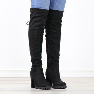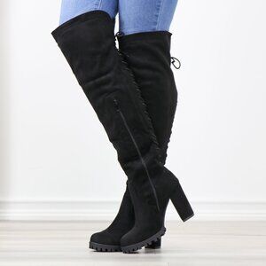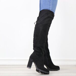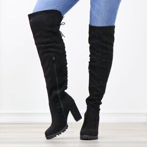Full Lace-Up Back Black Faux Suede Thigh High Over The Knee Lug Block Heel Boots