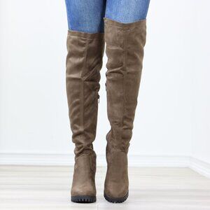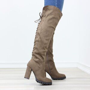 Full Lace-Up Back Taupe Faux Suede Thigh High Over The Knee Lug Block Heeled Boo