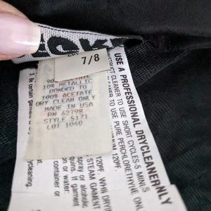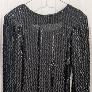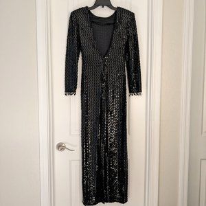 Stunning full-length, long-sleeved jet black sequined gown with dramatic low cut back by Degré. This gown is truly a showstopper! If you want to be noticed, this is the dress to be wearing. Beaded detail at sleeves, slit at center back hem, padded shoulders, back zipper. Fabric: Acetate. Dry Clean Only. Size 7/8.