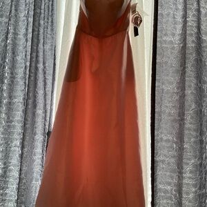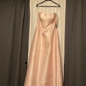 Never worn, tags attached strapless (detachable- sew it yourself, optional neck or shoulder straps included-pictured) full length, blush pink gown by Alfred Sung. This beautiful, bridesmaid or special occasion dress features a full maxi straight line shape with a fitted bodice top that includes flexible boning at the shaped bust and sides for lovely form. The bodice also has a very soft silicone lining around the chest to help keep the dress in place. I worked at a bridal shop and was given unused inventory as bonuses for hard work. This beauty has a horizontal cinch seam just above the natural waist and drops down to a gorgeous straight line but full bottom. 100% polyester- machine wash cold. I would recommend hanging it to dry. It could use a good steam. I’m sorry, I just can’t afford a steamer at the moment. Size 10 This dress has a beautiful shape.