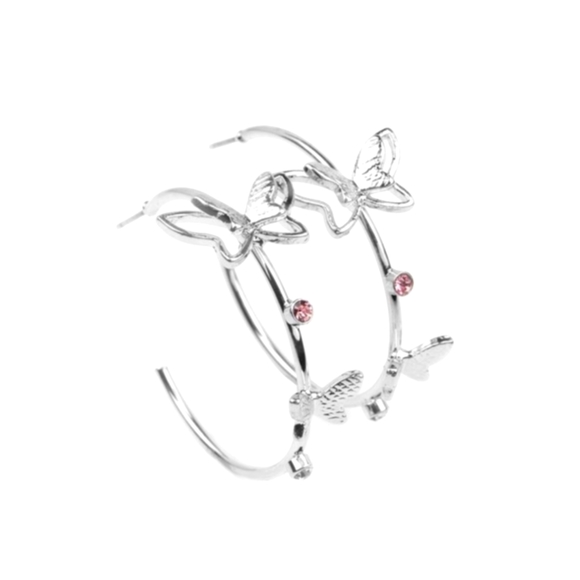 A pair of dainty silver butterflies flutter atop a glistening silver hoop dotted with dainty pink rhinestones, creating a whimsical sight. Earring attaches to a standard post fitting. Hoop measures approximately 1 1/2" in diameter.