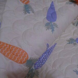 Whimsical full/queen carrots quilt ensemble. Reversible, gingham pattern in orange and cream