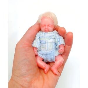 ღღღ This charming miniature baby boy measures a mere 4 inches from his delicate head to his adorable feet, truly embodying the essence of a newborn. At just a few days old, he has been meticulously crafted by Aisite, featuring micro-rooted hair and exquisite details accomplished through the application of special silicone paints, all expertly applied by myself. Each element of his design showcases a commitment to artistry and craftsmanship, including an outfit (varies), which has also been lovingly handmade. His body, composed entirely of soft silicone, enhances his tender and huggable nature, making him a delightful addition for collectors and enthusiasts alike. To complement this enchanting creation, he will arrive with a bottle, a toy, and a unique outfit, offering a complete package that highlights his meticulous design. This exquisite doll captures the magic of infancy in a way that is sure to bring joy to anyone fortunate enough to welcome him into their collection. ღღღ