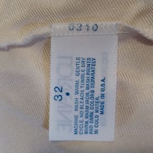 Cream colored nylon full slip, empire waist with stretchy lace straps and lace trim. Slightly stretchy. Excellent used condition, gently worn. Size 32. Approximate flat measurements: Bust - 15 inches, Waist - 14 inches, Length from shoulder to hem - 38½ inches.