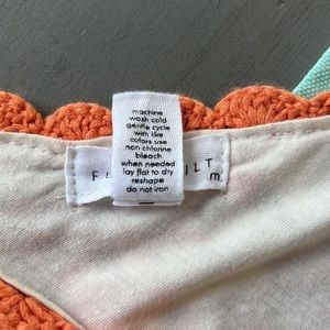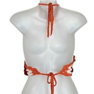 Full Tilt, Boho, Crocheted, Fully Lined Halter Top. White/cream, orange and red crocheted front with orange tie around the neck and the back. Fully lined. Body 100% acrylic, lining 50% polyester 50% cotton. Size medium. See photos for measurements to ensure fit.