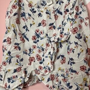 Description: White, blue, yellow and pink color. Floral pattern. Tank top. Has ruffles that criss crosses. 100% rayon.