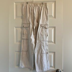 Cream colored cargo pants with stretchy elastic waist and brown stitching. Zipper and 2 buttons