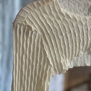 Add the perfect finishing touch to any outfit with this cream-colored textured bolero shrug from Full Tilt. Made from a soft and stretchy blend of 90% nylon and 10% spandex, it features a unique wrinkle-textured fabric that adds dimension and style. This closed-front shrug has a cropped fit, ideal for layering over dresses or tanks. Brand new with tags and in flawless condition. Size Small.
