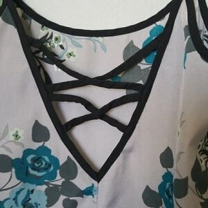 Super cute! Lightweight, criss cross straps across the back. Adjustable straps. Small stain in front, see pic. Its not hugely noticeable in my opinion. No stretch to fabric. Has a slight shiny sheen to the top. Casual, hang out, romantic, festival, date night, brunch, garden, botanical, romantic, moody, feminine, office, workplace