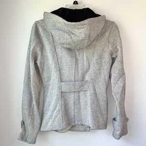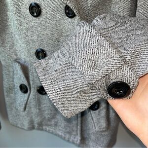 Soft grey Marled pea coat with with front pockets and hood. Black buttons on the lapel.