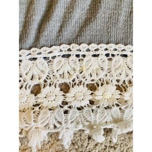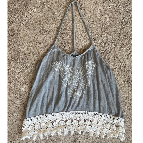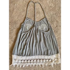 Gray racer back Full Tilt tank! Full waist length tank with boho embroidery edging all the way around. Super comfortable being made out of 97% rayon.