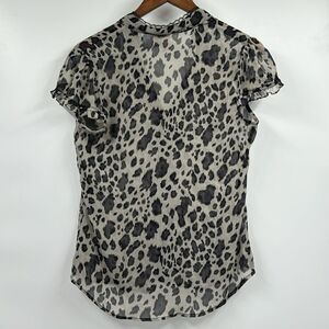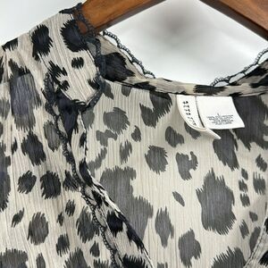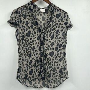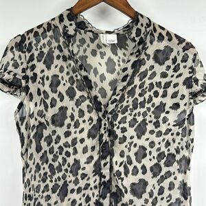 Button up design with Ruffle and lace trim. Cap sleeves, semi-sheer leopard print. 100% poly. Gently used condition with no visible flaws.