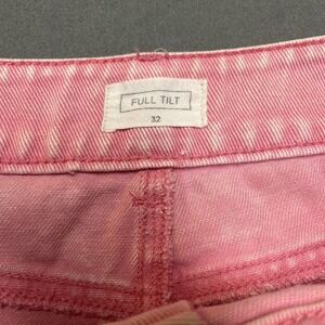 The product is a pair of Full Tilt Straight Leg High Waist Pink Cargo Jeans in women's size 32. Made from denim fabric, these jeans feature a zip closure, waist clasp accents, and cargo pockets. With a high rise and straight style, they have a 28.5 inch inseam and are machine washable. The pink color and solid pattern make them versatile for all seasons. Perfect for those looking for a 90s-inspired fashion statement with a hint of personalization.