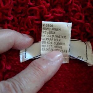 This sweater vest has a wonderfully soft texture, almost velvet feel. Color is a bright holiday red, not conveyed will in the pictures. It's a gorgeous candy apple red. It has a fun curly yarn collar that gives it a distinct style. Full red metal zipper works smoothly. Small ribbed knit edge along bottom hem and arm openings. Fashionable long length.