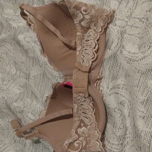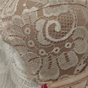 Beige full coverage bra. Lace overlay with rhinestone details