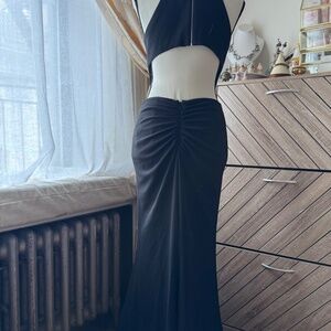 NWT. Black full length gown from Aqua. Has flattering cut outs on the side and a sporty silhouette from the back with a choker neckline. A modern take on a sleek and classic design. I've just never had the occasion to wear it and have reached for other things when I have a formal event.