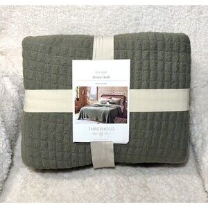 This Threshold jersey quilt offers the comfort of your favorite t-shirt with the warmth of a quilt. Its soft texture and neutral dark olive color make it perfect for layering or using alone. Ideal for gifting or updating your bedroom with a fresh, cozy look.