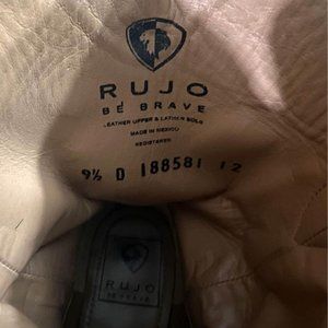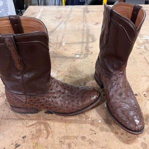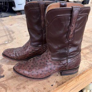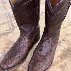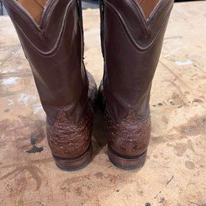 Mocha (brown) western boots bought recently from Rujo Boot Company, known for high quality, comfortability, and handmade in Leon, Mexico. The Lucky is a Full-Quill Ostrich boot in Roper style. 8-inch shaft in Caravan Calfskin lining, Goodyear-welted outsole with a comfortable 1.1-inch stacked leather heel, and an eye-catching Full-Quill Ostrich vamp is durable and eye-catching. Full-Quill Ostrich, Toe R-Toe, Heel 1.1". Retailed for $410, now sold out! Worn only a few times. Sharp boots in excellent condition!!