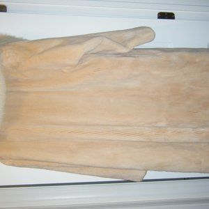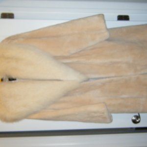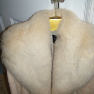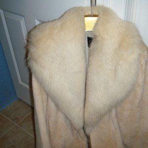 Size is Large (L), but could fit Medium (M) since no furrier hooks have been added yet. Like New, worn only once. Coat is light beige with wide white Fox fur collar. Original cost $4,500 in the late 1980's (equivalent to $10,000 today). Full side pockets; very warm for winter wear. Will accept REASONABLE offers.