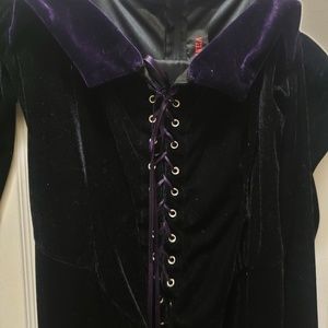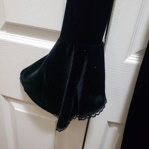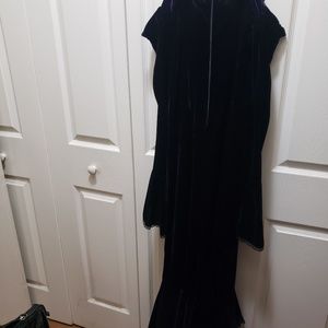 Velvet dress with labelled low collar and corset lacing front. Sleeves have full cuff. Small train. Off the shoulder with adjustable straps. I call her Morticia.
