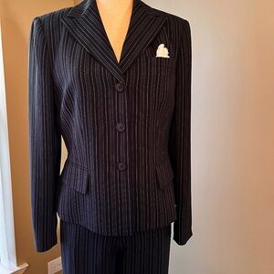 Fully lined 2 piece pant suit by Kasper, Navy blue pinstriped, with chest pocket and kerchief, faux pocket flaps at the waist, side zip pants, size 6P, dry clean only