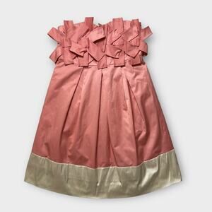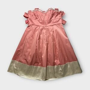 - Pink Coquette Cocktail Party Strapless Taffeta Mini Dress, bows on bodice, pleated, cream trim, zip closure, lined. 1 bow has come unattached from the other. Not noticeable unless you know what to look for. Also 1 small dark spot. Both shown in photos. Photos taken in natural lighting.