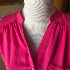Vivid pink color and in very good used condition. One pocket in the front. Two buttons at the neckline.
