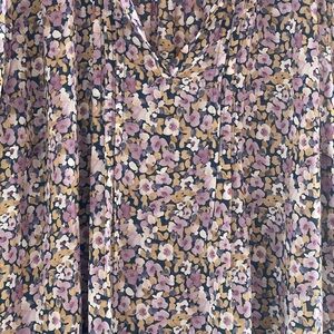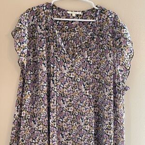 Chic floral top with ruffle sleeves, perfect for any occasion. Features a blend of purple and cream hues for a stylish look.