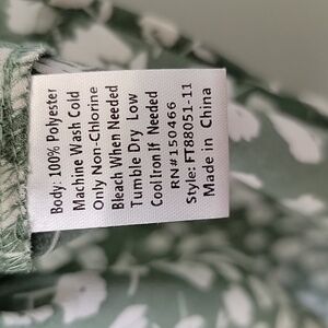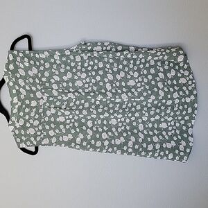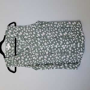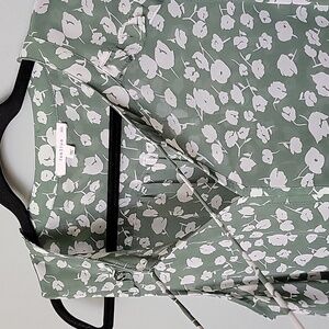 Green with white floral print. Sheer fabric. Lightweight fabric, doesn't stretch. Has strings at the neck that can be worn tied or untied. Great condition. Slight high low style. Office, workplace, spring, summer, dressy, classy, feminine, girly, dinner, date night