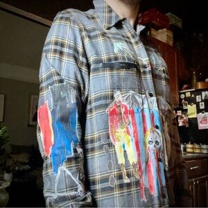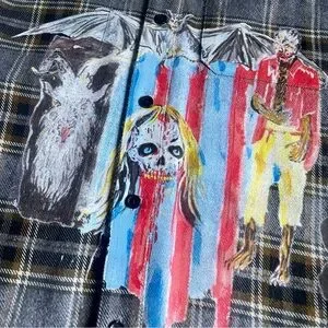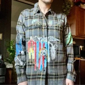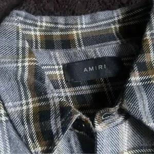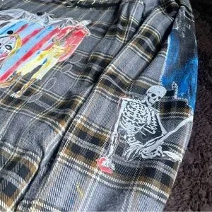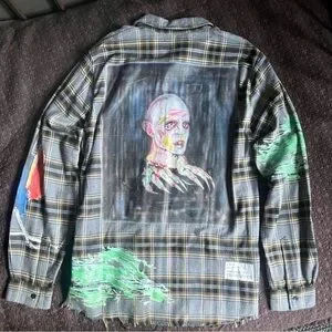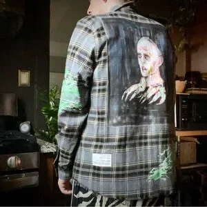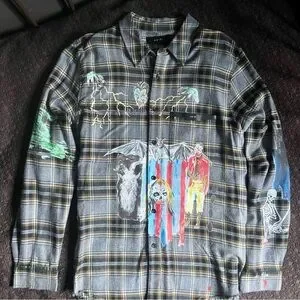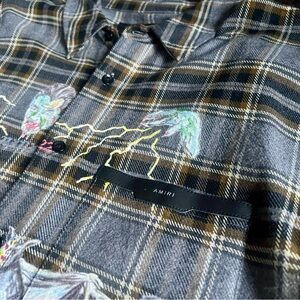 Amiri x Wes Lang Blood ‘38 button up. Featuring a detailed leather front breast pocket with “Amiri” printed on it. Fun graphics decorate all over the shirt including the front, sleeves and back, it is great fun just having the piece hung up to look at.