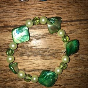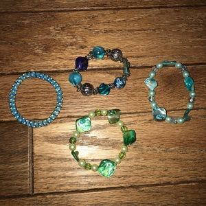 Add pops of green and blue with this fun arm party stack of 4 bracelets! Each is unique, so wear them together, mix and match, or wear one solo. Worn twice and no signs of use.