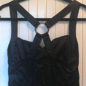 Fun top by Bebe- plain black silk-like shiny fabric. Detail at the chest, which is slightly padded. Criss cross back with metal loop detail. Size small. (Same as the blue and black patterned one I also have listed)