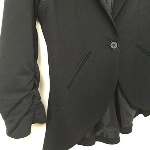 Super cute one button blazer from Nordstrom with fun ruching on the sleeves. Flattering pleats on the back of the coat. Faux pockets for a slim look. This jacket is great for work or a night out! Like new condition, no issues.