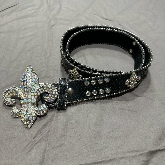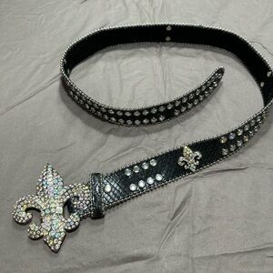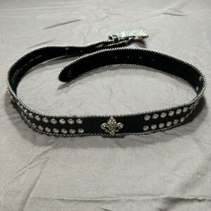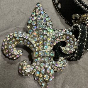 Genuine black leather belt with rhinestones. Belt buckle is 4 inches high, belt is 40 inches in length.