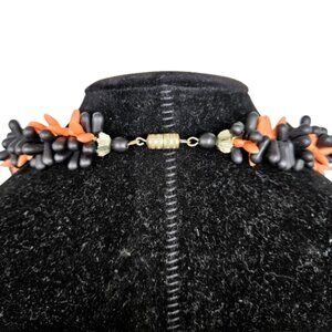 The product is a fun and stylish black and coral-colored bead necklace. The necklace features a bohemian and fashion-forward design, with orange main stones adding a pop of color. The beaded style gives it a casual and trendy look, perfect for accessorizing various outfits. Easy to use crew type clasp.