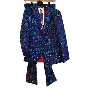 Item Details: Holiday season party in this fun blue Christmas decorations suit, pants, and matching tie set!